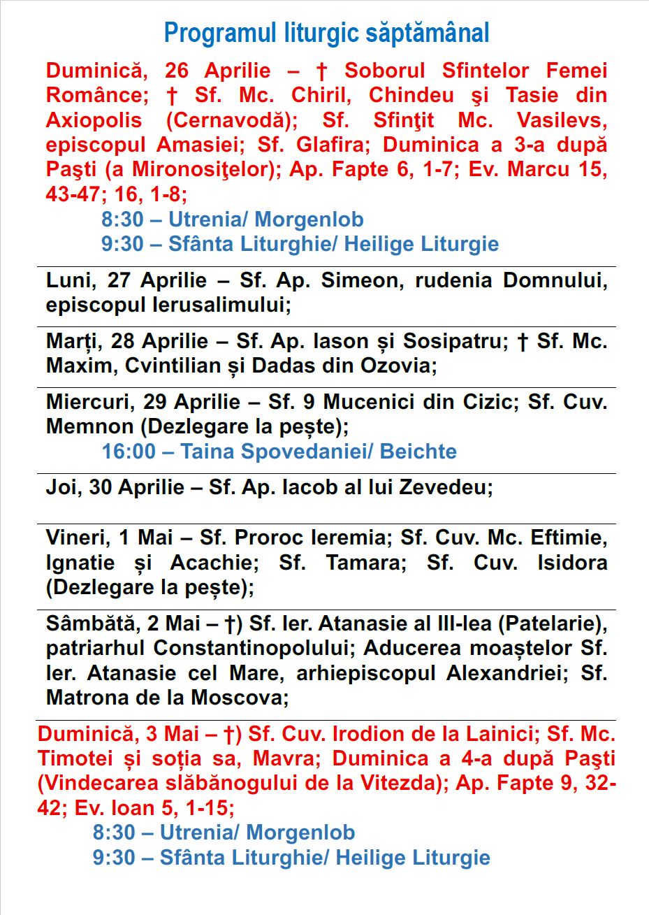 Programul liturgic săptămânal în perioada 19.04.2026-26.04.2026