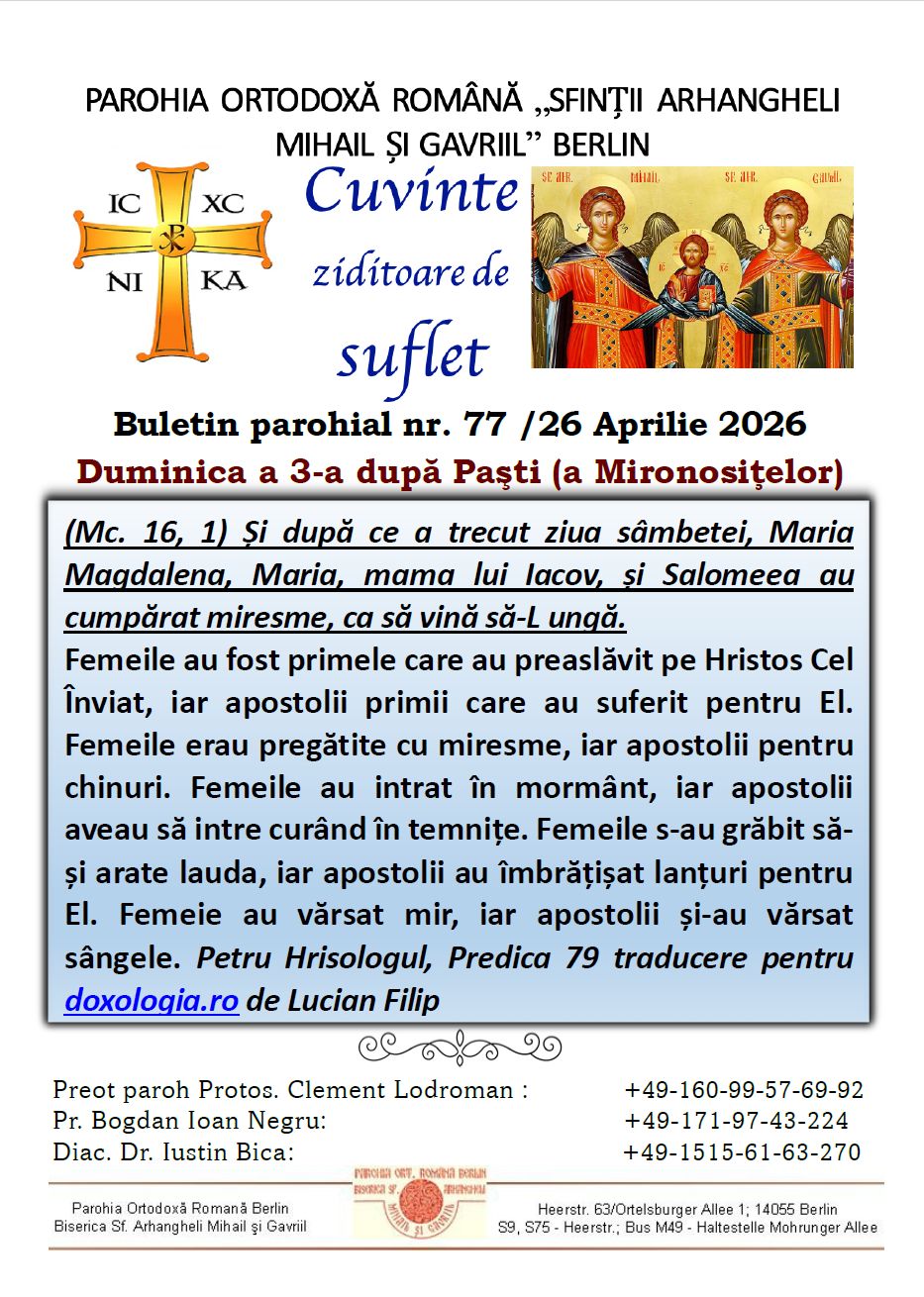 Credincioșii care doresc eliberarea adeverințelor de donație (Sammelbestätigung) sunt rugați să transmită un e-mail la adresa parohiei parohiaberlin@gmail.com, în care să menționeze adresa de domiciliu din Germania.