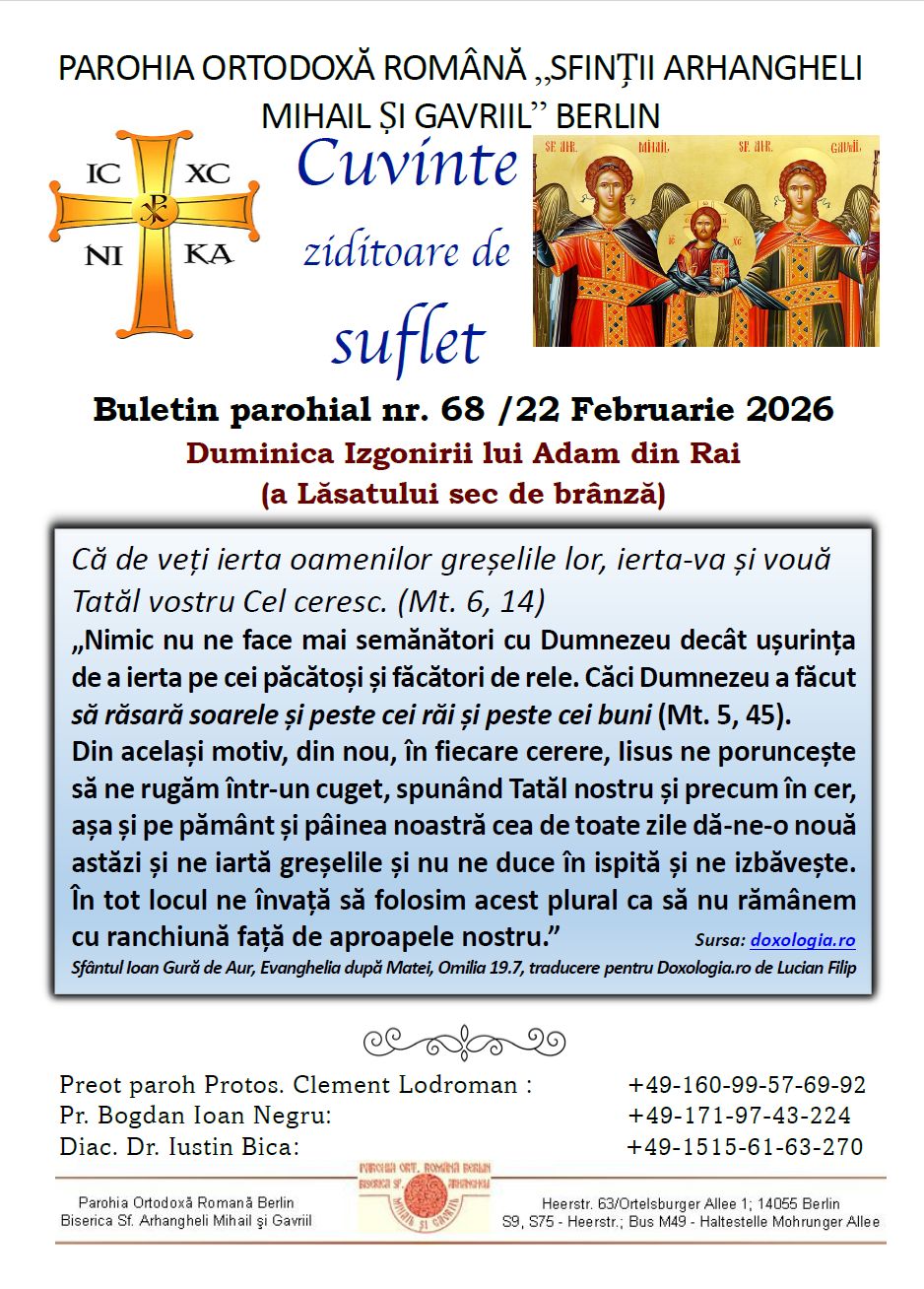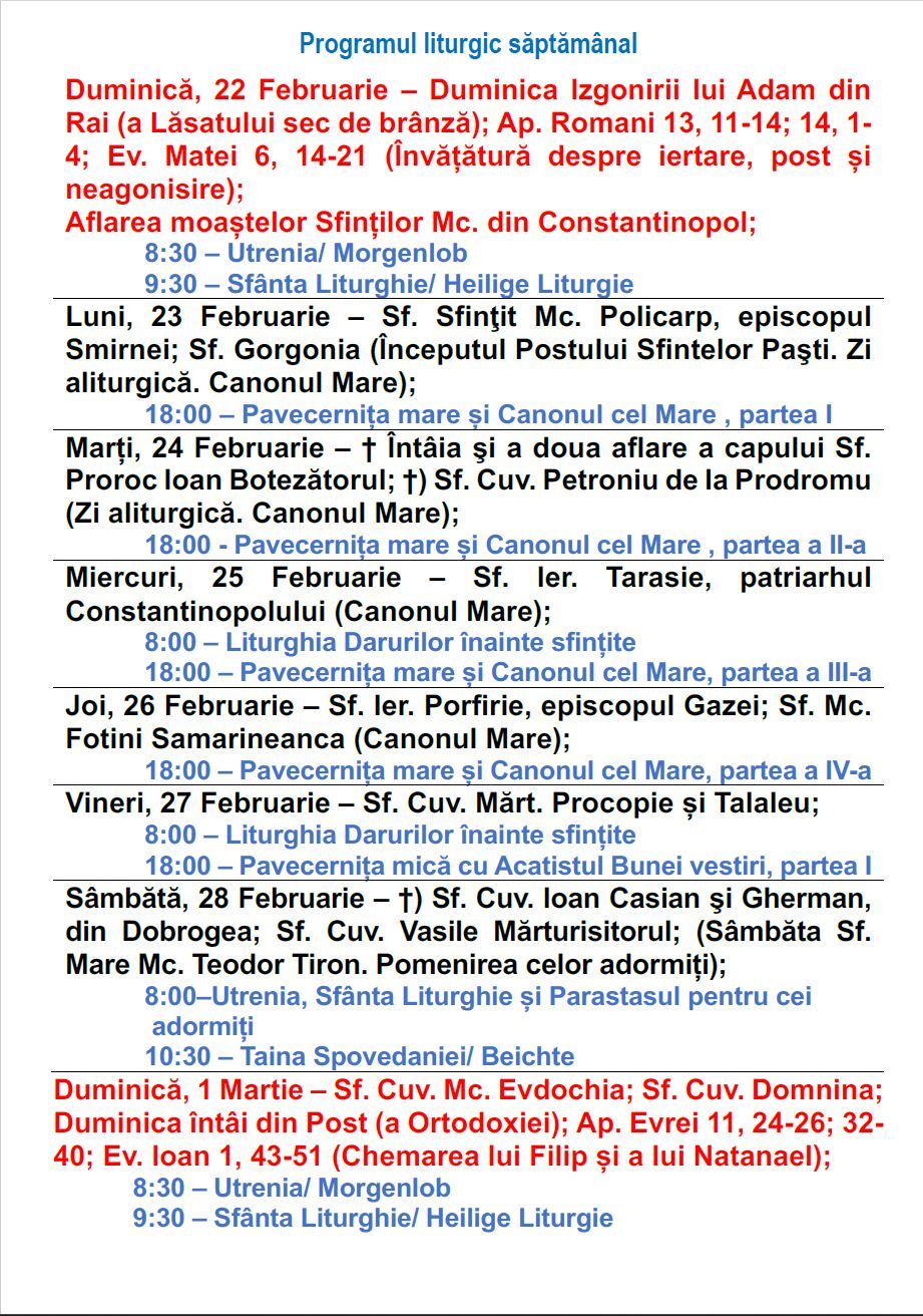 Programul liturgic săptămânal în perioada 22.02.2026-01.03.2026
